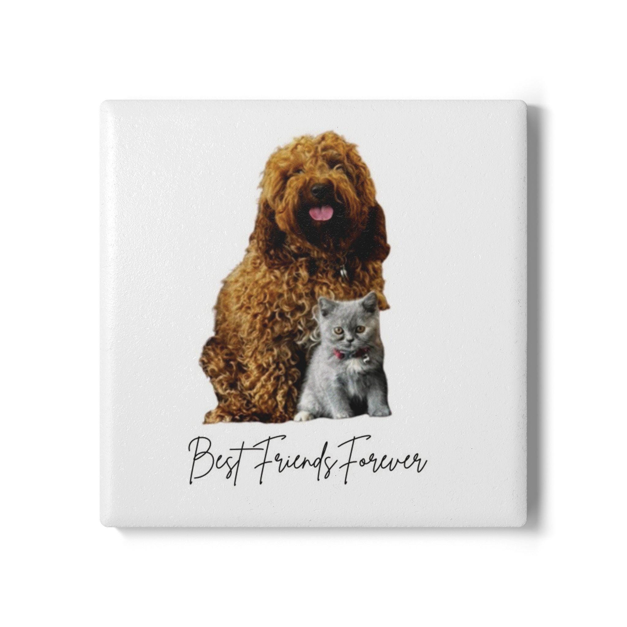 Best Friends Forever dog and cat Ceramic Coaster | Pet friendship illustration